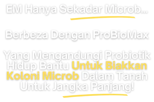 ProBioMax ialah Gabungan Probiotik Hidup + Asid Amino Gred Tinggi Yang Bertugas Memulihkan Ekosistem Tanah, Mengaktifkan Akar Dan Menjadikan Pengunaan NPK Lebih Berkesan & Dos NPK Berkurang Sehingga 60%