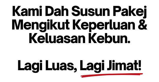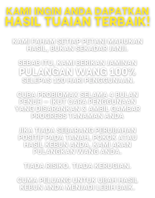 Jika tiada sebarang perubahan positif pada tanah, pokok atau hasil kebun anda, kami akan pulangkan wang anda.