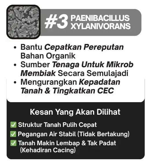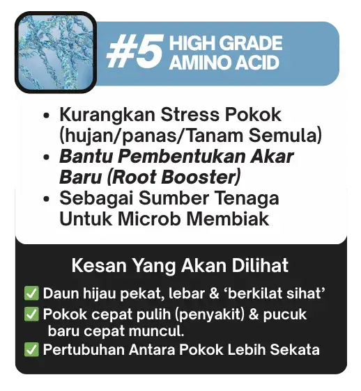 ➡ Mengaktifkan ekosistem tanah, tingkatkan serapan nutrien, dan galakkan pertumbuhan akar yang sihat.